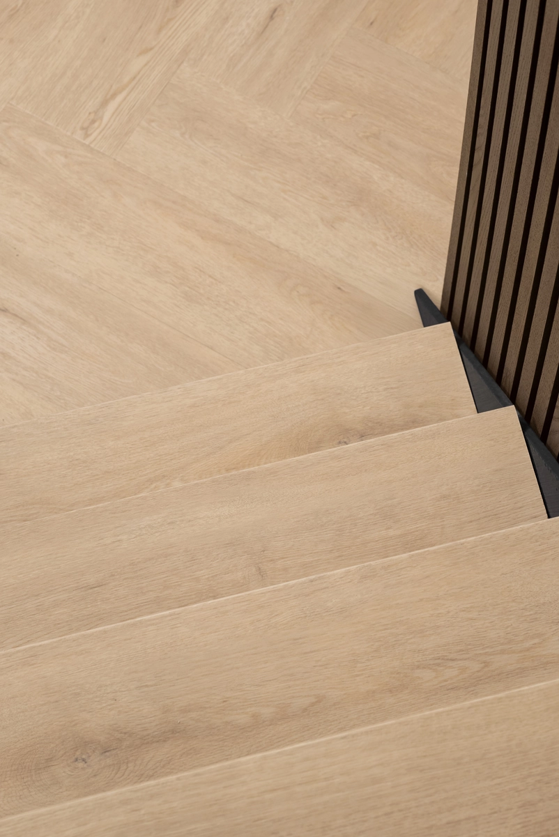 Avec les marches de recouvrement massives Floer, vous pouvez facilement placer les marches sur votre escalier existant : il suffit de les découper à la bonne taille et le tour est joué. Que vous ayez un escalier droit ou un escalier avec des tournants, ces marches de recouvrement conviennent à différentes formes d’escaliers. La subtile teinte gris-beige des marches en chêne s’accorde parfaitement avec le sol Vinyl Gaia gris-beige, créant ainsi un ensemble harmonieux dans votre intérieur. Parfait pour les projets de construction neuve comme pour les rénovations !